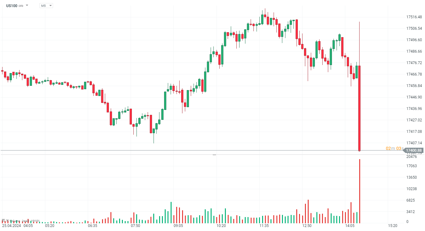 After weaker than expected GDP data with very low jobless claims and higher than expected price index, futures on Nasdaq 100 (US100) weakened as traders expect Fed members to be pressured and hawkish, despite not as strong as expected American economy momentum. The biggest risk is of course as higher prices meaning inflationary pressure.