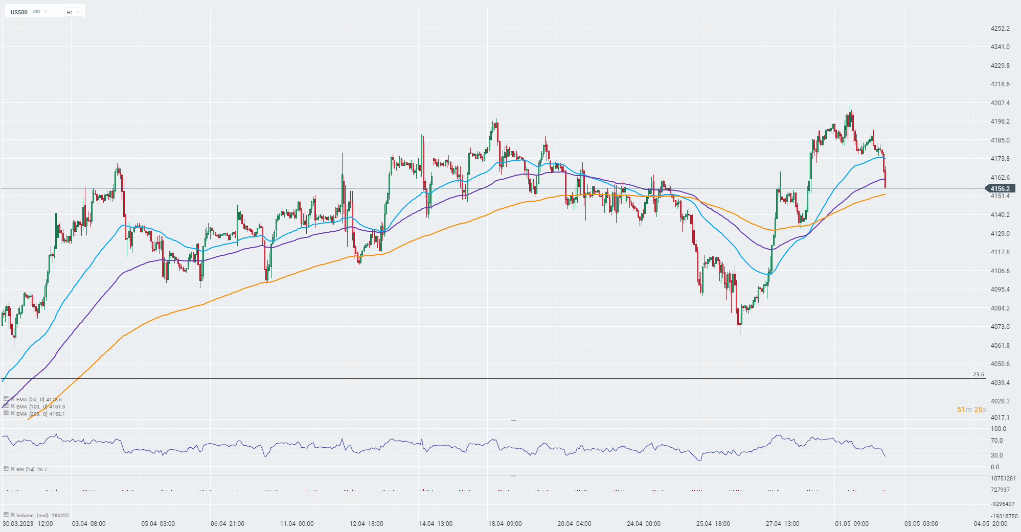 US500 quotations are going down dynamically after the recessionary tone of today's macro data reading. Crude oil is also behaving similarly, losing more than 3.6% at the moment.