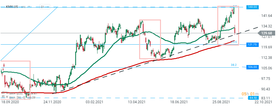CarMax (KMX.US) stock launched today's session with a massive bearish price gap and broke below the 50 SMA (red line). Currently the price is testing an upward trendline. Should a break lower occur, then downward correction may deepen towards support at $121.75 which is marked with the lower limit of the 1:1 structure, 200 SMA (red line) and 23.6% Fibonacci retracement of the upward wave launched in March 2020. On the other hand, if buyers manage to halt declines here, then another upward impulse towards all-time high at $148.00 may be launched. Source: xStation5