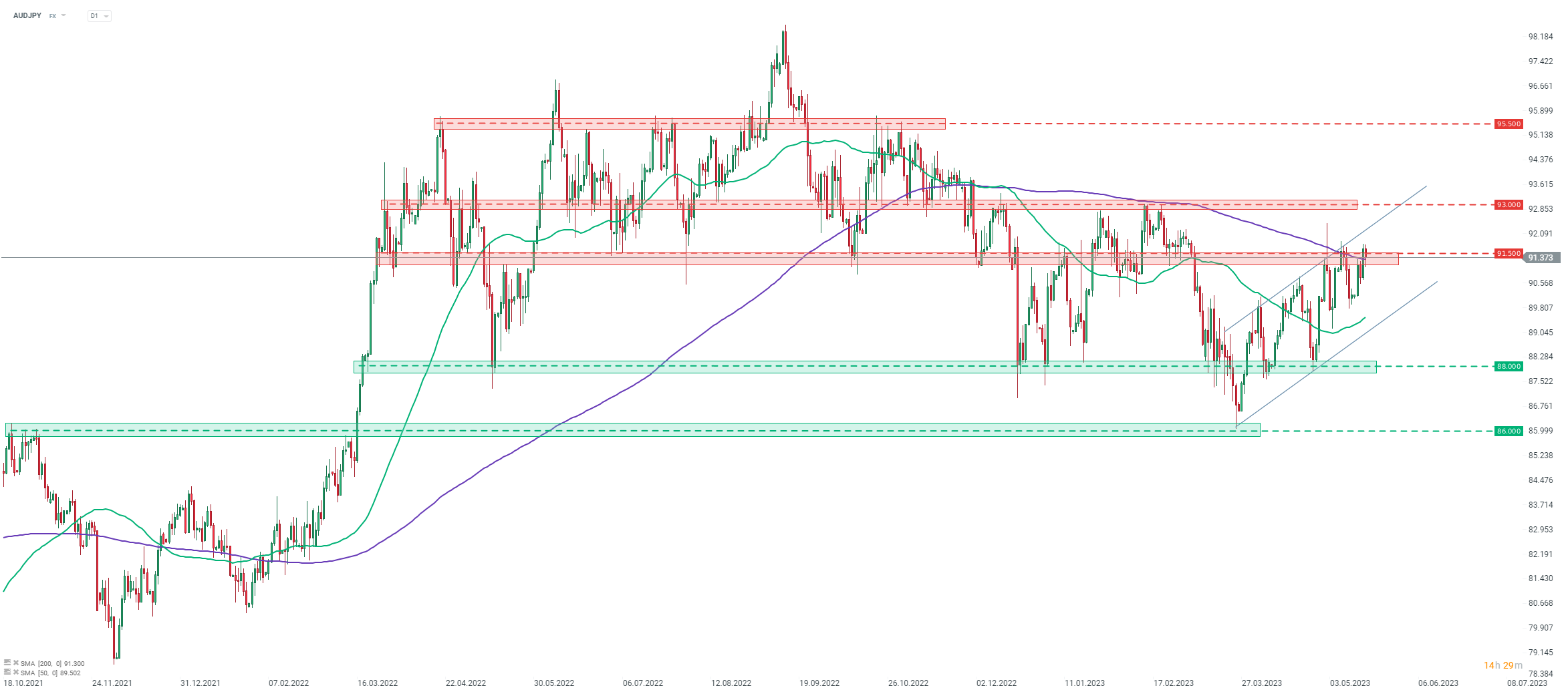 Australian jobs data released trigger a pullback on AUD market. Taking a look at AUDJPY chart at D1 interval, we can see that the pair managed to climb above 200-session moving average (purple line) and attempted to move above the resistance zone ranging below 91.50 mark. However, today's pullback puts this breakout under question. If we see a daily close below the 200-session moving average, the pair may be set for a correction. However, one should remember that the overall trend is upward with the pair trading in a bullish price channel.