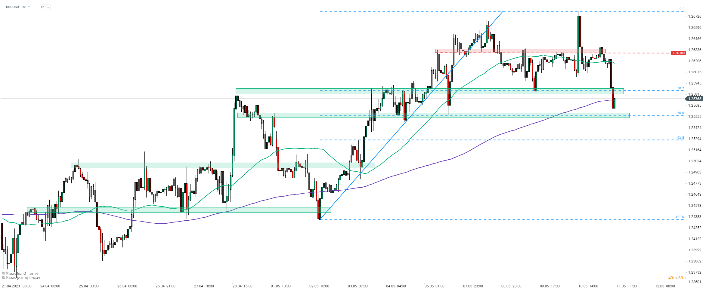 Taking a look at GBPUSD chart at H1 interval, one can see that the pair has been pulling back this morning. Pair dropped below the support zone marked with 38.2% retracement of the upward impulse launched on May 2, 2023 (1.2585 area). Downward move did not stop there with pair continuing to move lower and dropping below 200-hour moving average (purple line). An attempt to climb back above this moving average can be spotted at press time but should bulls fail to do so, the pair may look towards a test of the support zone marked with 50% retracement in the 1.2557 area.