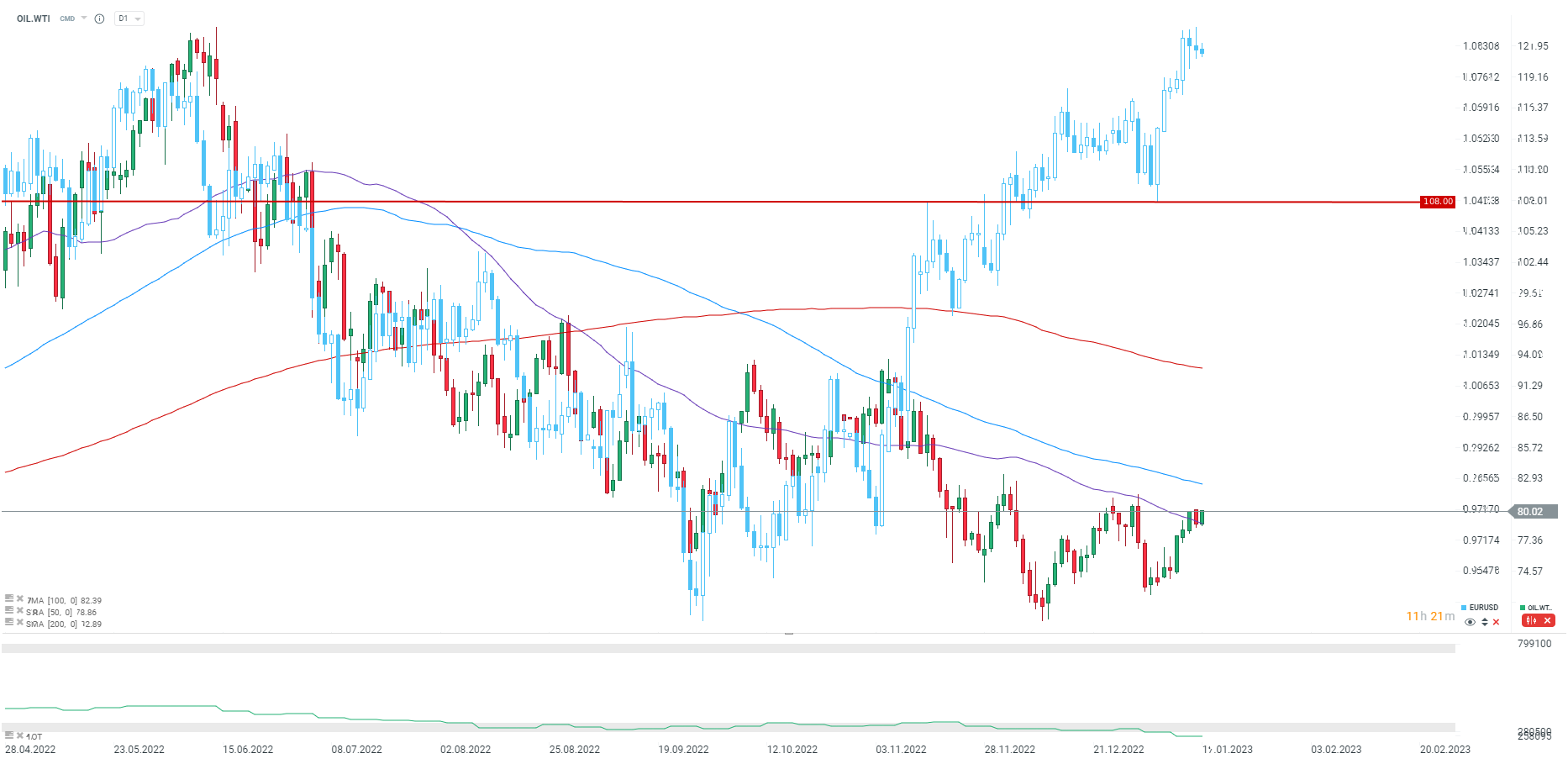 WTI (OIL.WTI) is testing $80 per barrel area, after climbing above 50-session moving average. A strong bear camp is located in the $80-82 area, what may limit crude's ability to launch a new trend. Of course, we continue to weakening of the US dollar what is a positive for countries importing oil. Source: xStation5