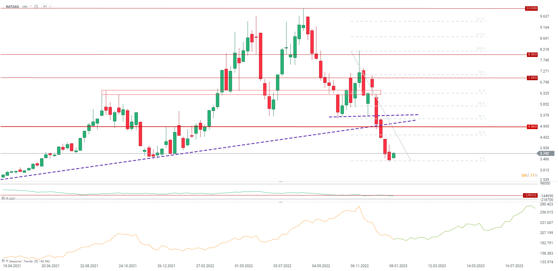 Keeping natural gas prices at low levels will be key for EURUSD. Imports prices were crucial for the European economy in 2022. High commodity prices exerted pressure on commodity, what further boosted import prices. Currently we can see reversal in this trend. Source: Bloomberg, XTB
