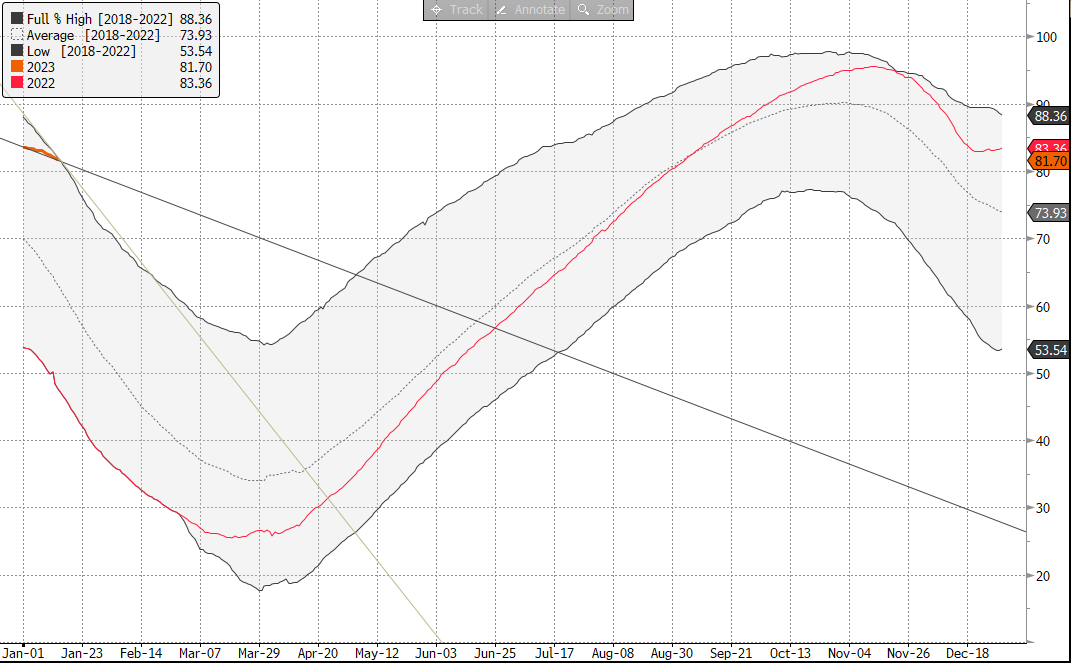 European gas inventories are over-80% full. Should current trend and pace of inventory drawdowns continue, inventories may be even 70% at the end of heating season! On the other hand, European imports are lower than a year ago (even excluding Russia) therefore one cannot rule out elevated volatility on the European gas market in Q2 and Q3 2023. Source: Bloomberg