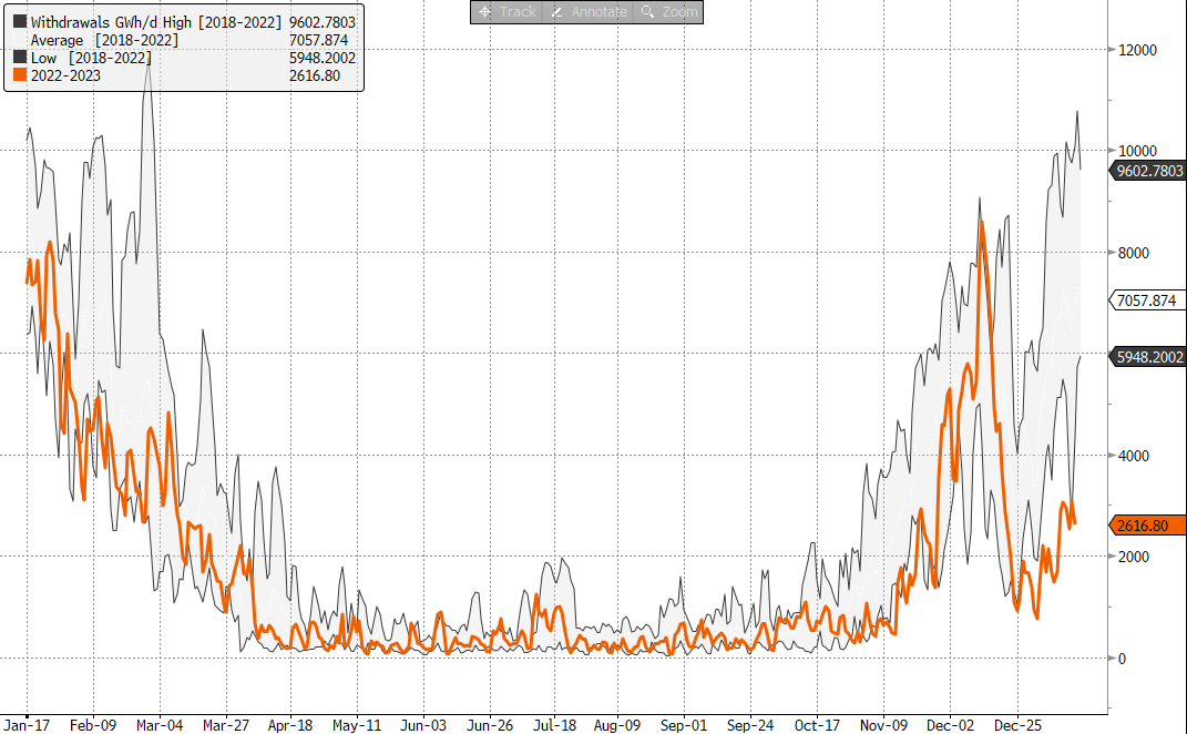 Natural gas withdrawals from the system are even as much as 3 times smaller than usually in this period of the year