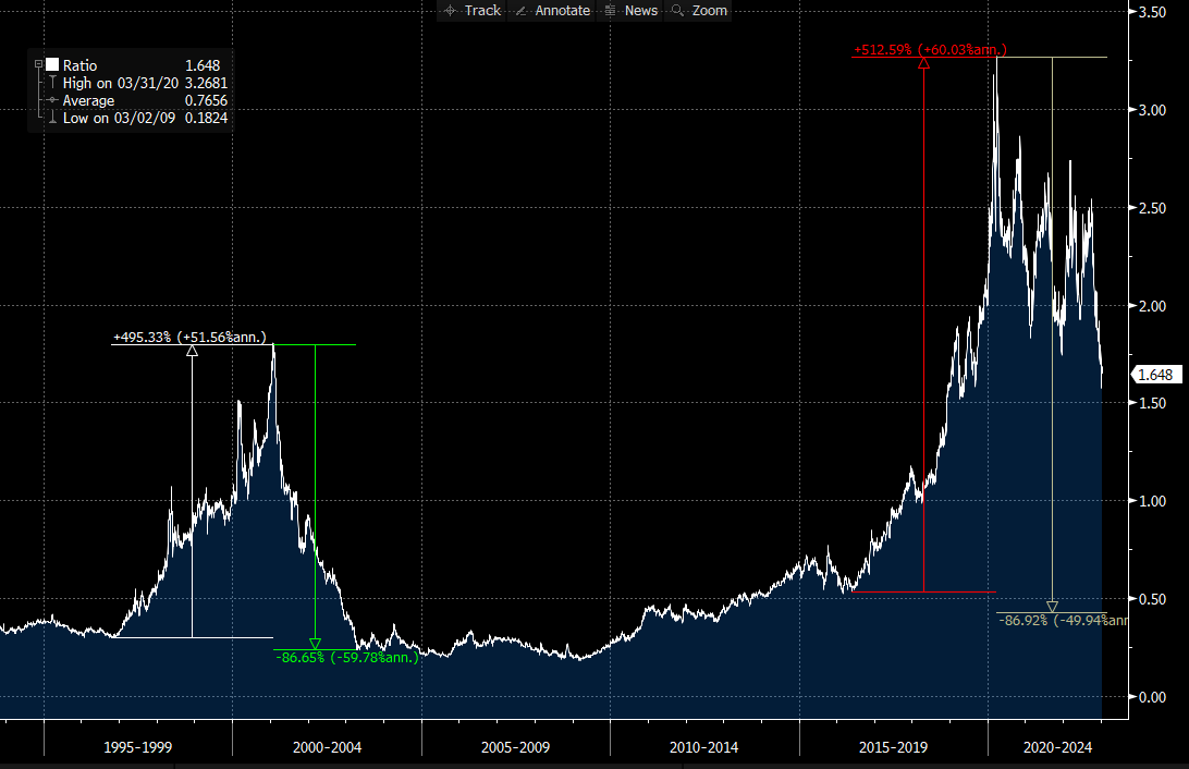 When it comes to history, price ratio of palladium-to-platinum rarely exceeded 0.5 but palladium prices rallied significantly in relation to platinum prices during the dot-com bull market and just ahead of the Covid-19 pandemic. It looks likely that this ratio will head towards lower levels now. There is a chance that due to changes in demand outlook, one cannot rule out a repeat of the situation from the early 2000s when the price ratio dropped from around 1.8 to 0.25. Source: Bloomberg