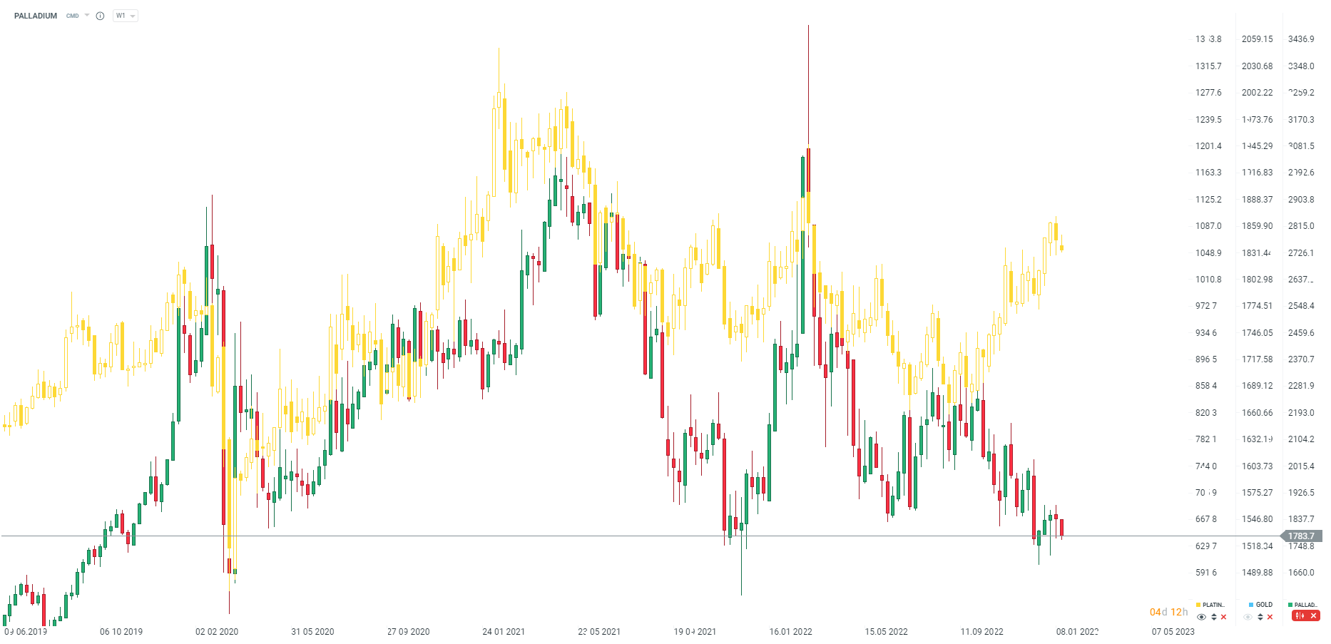 A significant divergence between palladium and platinum prices can be spotted since September 2022. Palladium prices are still much higher than platinum prices and therefore further widening of the divergence cannot be ruled out. Nevertheless, it should be noted that palladium trades near an important support marked with local lows from early-2020 and December 2021. Source: xStation5