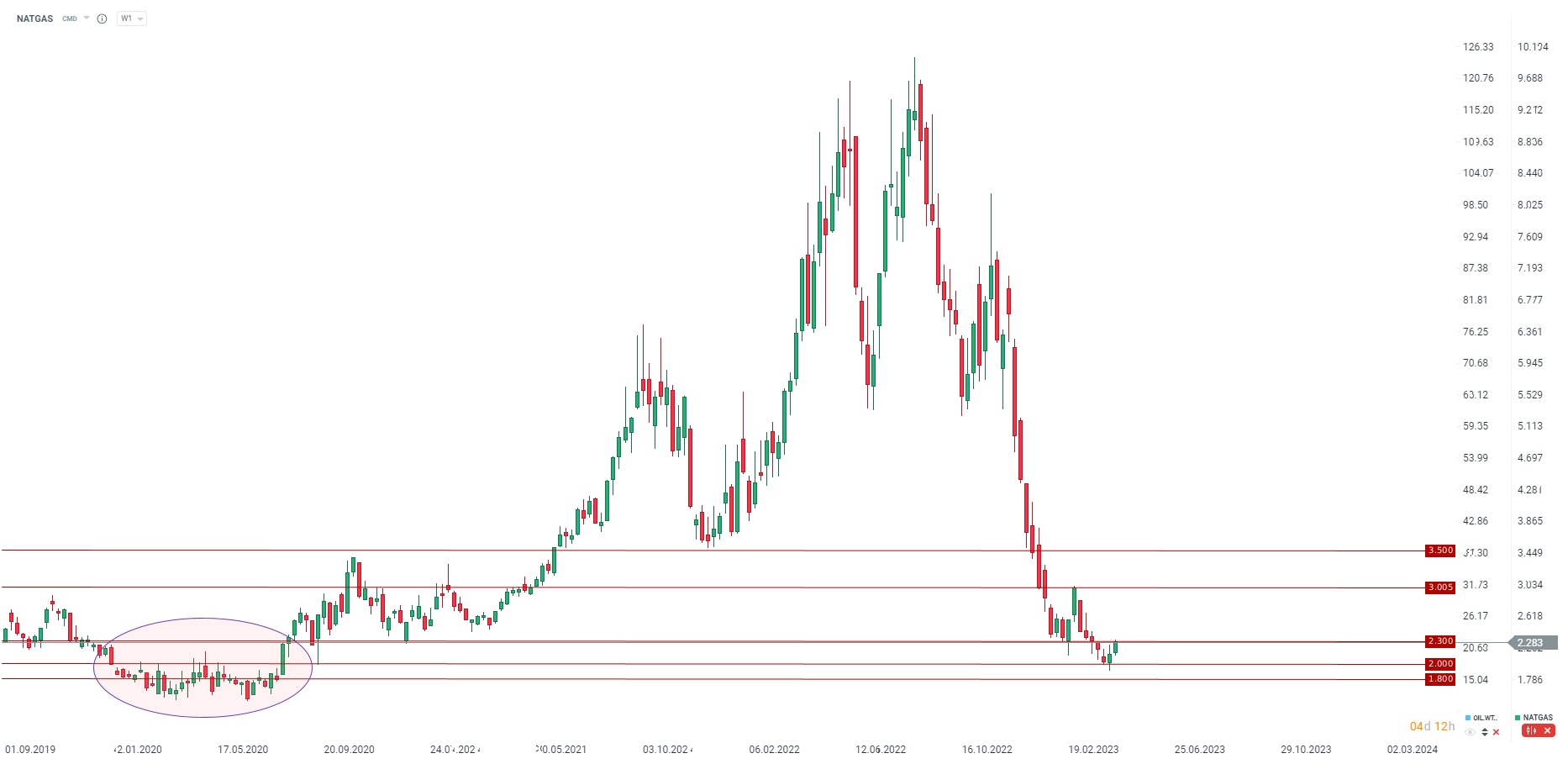 NATGAS experienced a relatively strong rebound this week but has run into $2.30 per MMBTu resistance zone. Current situation, in terms of demand, may resemble the one from 2020 (marked with a circle on the chart). Production needs to drop for comparative inventories to keep declining and generate a stronger signal. However, a period of lower prices may be needed first. Source: xStation5