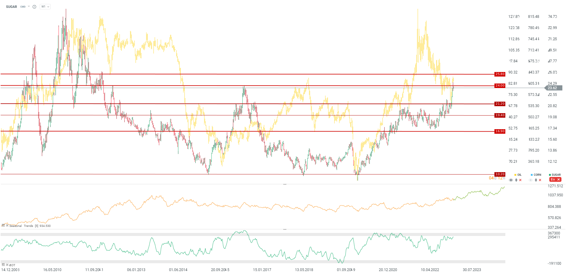 SUGAR broke above 2016 highs and the fundamental situation starts to resemble one from 2011. If Brazilian production is negatively affected by El Nino, one cannot rule out the continuation of sugar price rally. On the other hand, 2011 rally on the sugar market coincided with strong gains on oil market. Currently, oil is trying to rebound. Source: xStation5