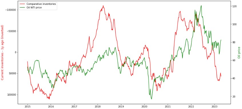 - Comparative inventories have been dropping recently (inverted axis on the chart below) but not from extreme levels. Moreover, comparative inventories have been giving contrarian signals for the oil market when crude has been trading at lower prices, even as low as below $40 per barrel. Currently, it is more than $80 per barrel