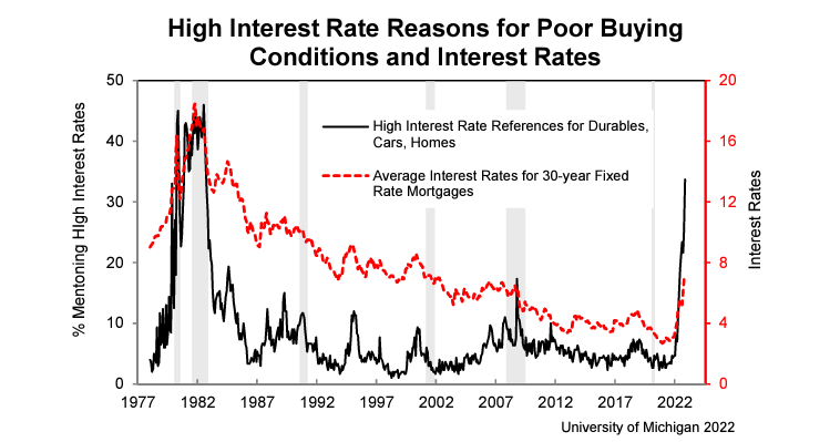 High interest rates are a cause of poor buying conditions and unfavorable interest rates, helping to choke demand in the US economy. The impact is particularly evident in durable goods, cars and homes. It's worth noting the similarities with the 'inflationary' period of the 1970s but average mortgage rates back then were substatnially higher. Source: University of Michigan