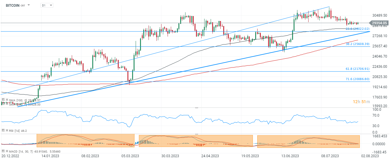 Bitcoin, D1 intervallum. Hosszú távon az árfolyam fenntartja a felfelé irányuló trendvonalat, érdemes megjegyezni a felfelé irányuló struktúra meglehetősen egységes "geometriáját", a MACD-n is (narancssárga téglalapok). Ez azt jelezné, hogy potenciálisan közelebb kerülünk egy újabb felfelé irányuló mozgáshoz, pillanatokkal egy rövid távú dinamikus csökkenési fázis előtt. A kulcsfontosságú szinteknek a 28 000 dolláros szintek tűnnek, amelyek nagyjából összhangban vannak az STH befektetői fókuszú BTC átlagával (28 500 dollár körül) és a 2022. decemberi felfelé irányuló hullám 23,6 Fibonacci-felszámolásával. Forrás: xStation5