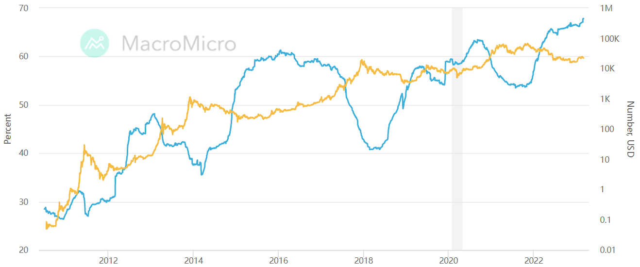 The supply of portfolios holding BTC, last active more than a year ago, has climbed to historic peaks as the current bull market continues, and is already close to 68%. The historical trend remains upward and shows that over time more and more BTC is being held by long-term investors and not deposited in the market. Source: MacroMicro