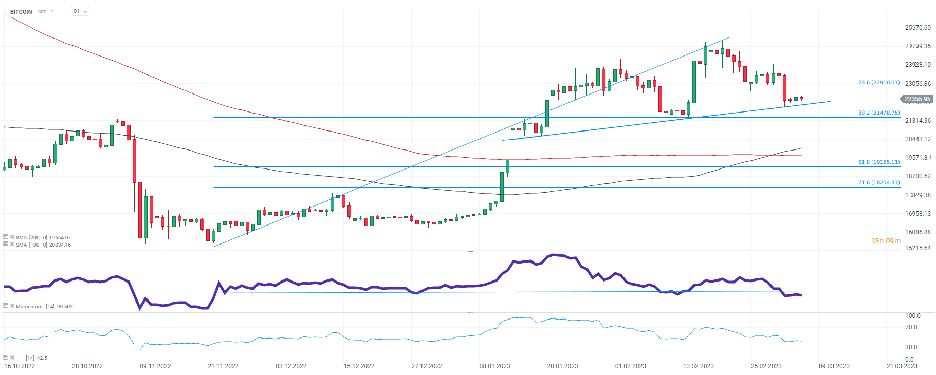 Bitcoin chart, D1 interval. The price is still holding an upward trend line from which an upward breakout is possible. However, if prices follow the upward trendline downward, the key zones may turn out to be the 38.2 Fibonacci abolition of the upward wave started in November at $21,500 and the aforementioned SMA200 (red line), which runs around $20,000. So far, the bullish formation of the golden cross, i.e. the intersection of the SMA100 (black line) above the SMA200 has still not resulted in increases. Source: xStation5