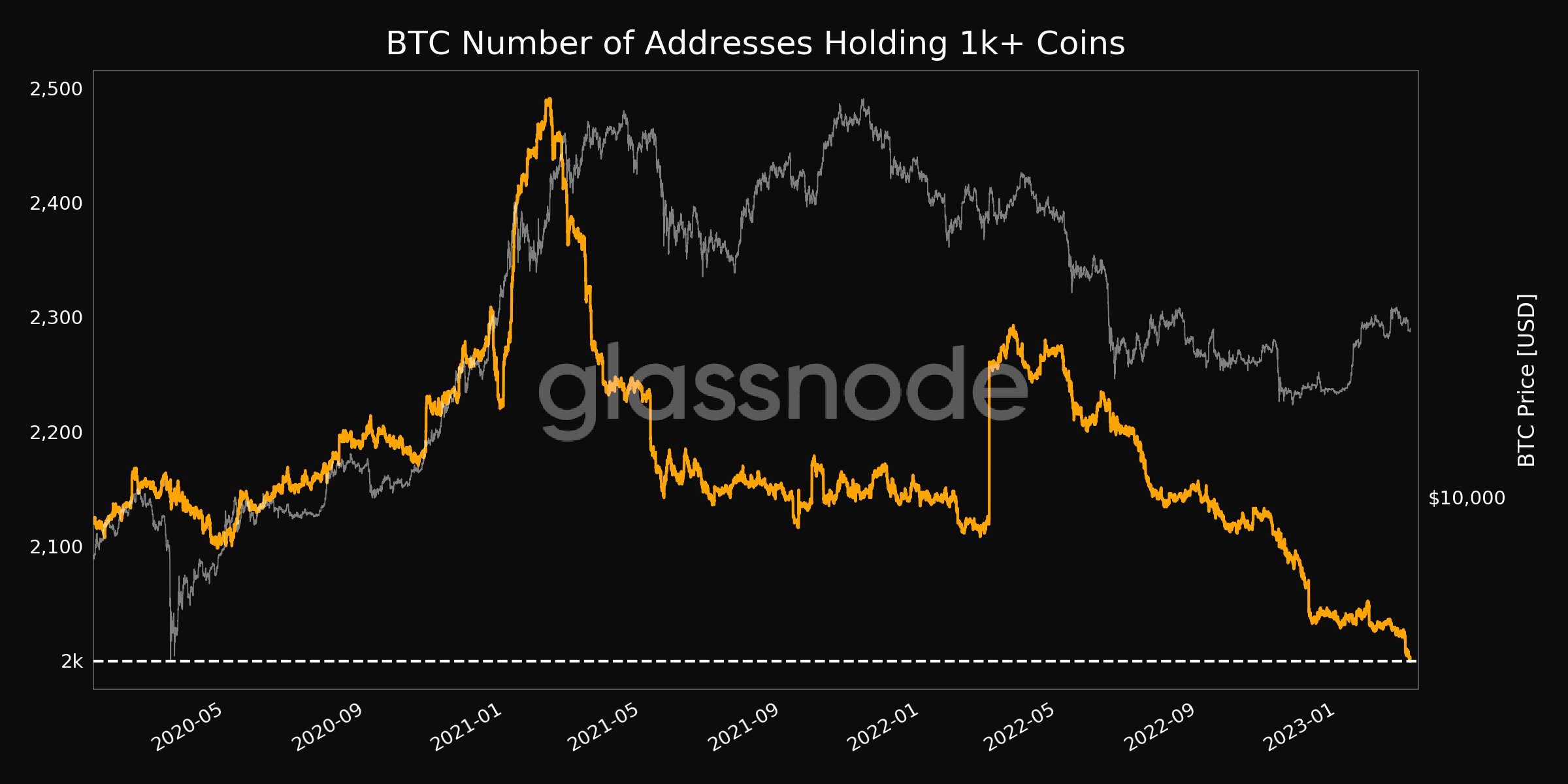 The number of BTC addresses holding more than 1,000 BTC has fallen dramatically since March 2020, signaling a possible weakening of sentiment among whales. However, it is unclear how the reading has been affected by the possible splitting of funds by the largest investors into so-called smaller portfolios. Source: Glassnode