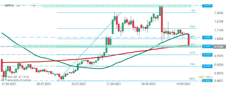 Ripple managed to break above $1.40 at the beginning of the month, however buyers failed to uphold momentum and price pulled back sharply. Currently price is testing major support at $0.92 which coincides with 200 SMA (red line) and 50% Fibonacci retracement of the upward wave which started in the second part of July. Should a break lower occur, then downward correction may deepen. Next target for sellers is located at $0.8190. On the other hand, if buyers will manage to halt declines here, then another upward impulse towards $1.03 may be launched. Source: xStation5