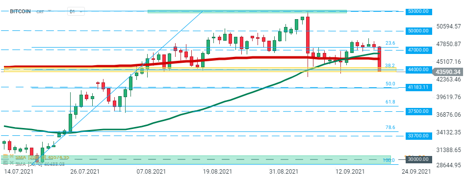 Bitcoin price fell sharply during today's session, broke below 50 SMA (green line) and 200 SMA (red line) and is currently testing major support at $44,000 which coincides with 38.2% Fibonacci retracement of the last upward wave and previous price reactions. Should break lower occur, then downward move may accelerate towards next support at $41,183. Source: xStation5