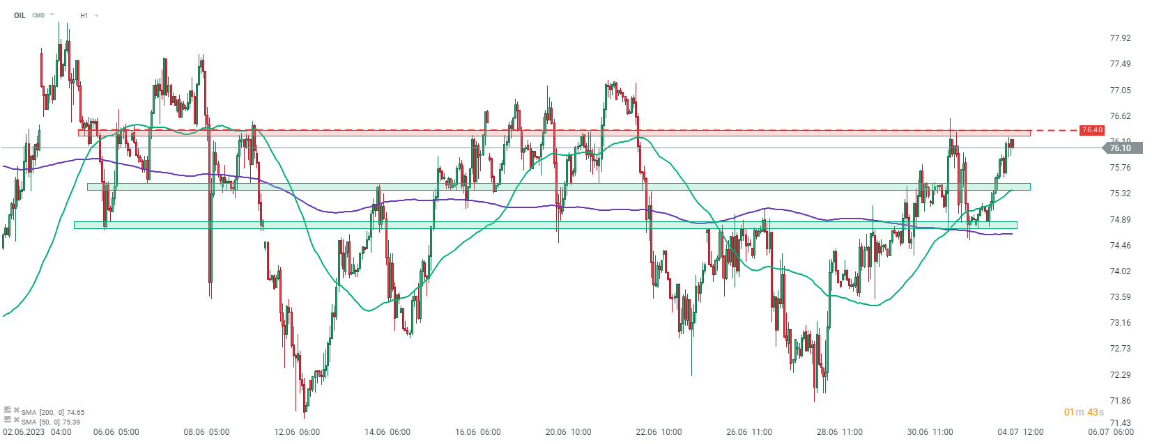 OIL traded higher today and once again tested a resistance zone ranging below $76.40 per barrel. Bulls failed to break above but the price remains above $76 per barrel. Source: xStation5