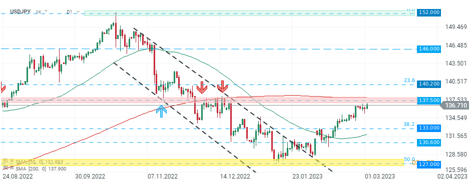 USDJPY pair rose over 0.50% on Thursday and is moving towards key resistance at 137.50. Source: xStation5