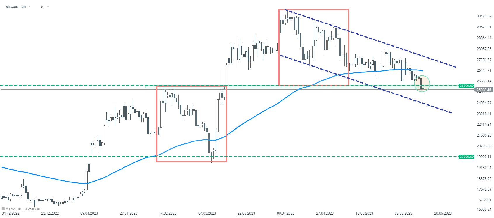 Cryptocurrencies do not share the optimism visible in the stock market. Bitcoin is trying to break key support in the regions of $25300, resulting from the previous maximum and the lower limit of the 1:1 arrangement. Source: xStation5.