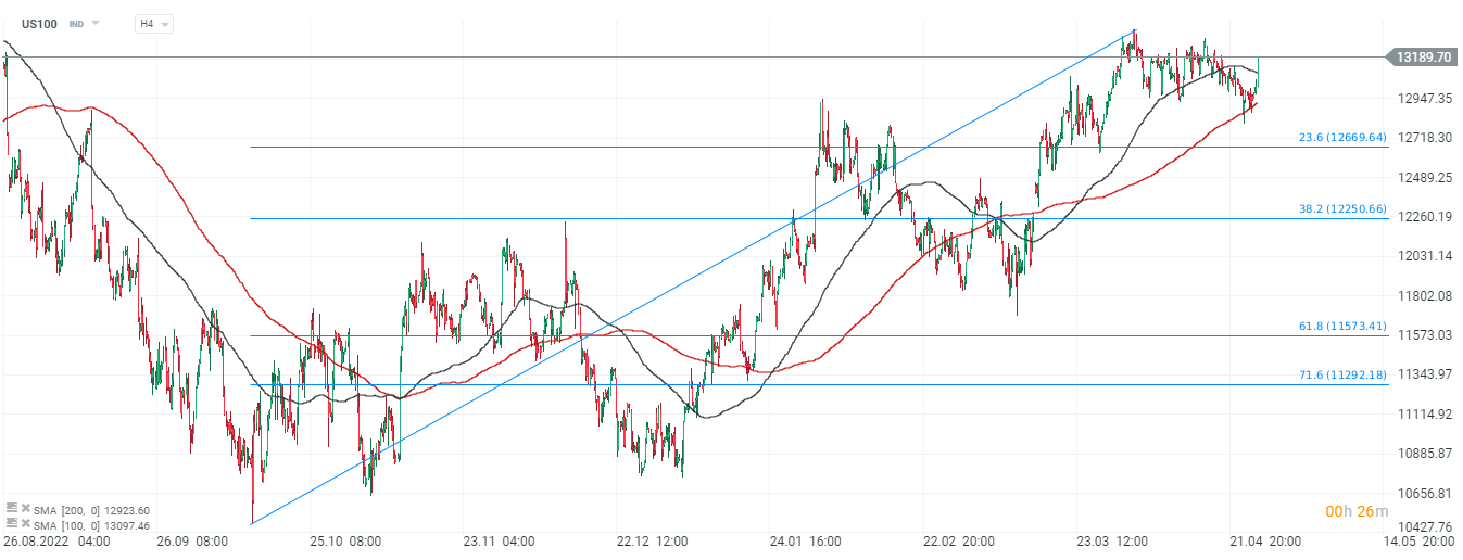 US100 bounced above SMA200 support (red line) and SMA100 zone at 13100 pt. The bulls may have the appetite to attack highs at 13,350 zone. Source: xStation5