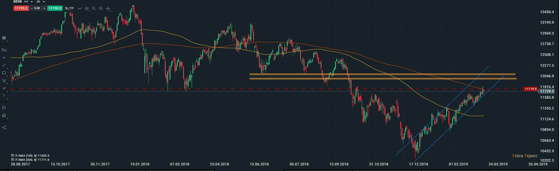 Németország részvénypiaca tegnap a legerősebbnek mutatkozott Európában, mivel a DE30 1,25%-kal 11825 pontra emelkedett - a legmagasabb szint 2018 októbere óta. A piacnak tetszett a ZEW indexet, amely 11 havi csúcsra emelkedett,ami elég optimista a mai Fed-döntése előtt. Miután a DE30 összetörte a 11775 ellenállást, a következő szintekre kell figyelni: pszichológiai 12000 és technikai 12100. Jelenleg korrekciós időszakot figyelhetünk meg a 11700-as régióban, a