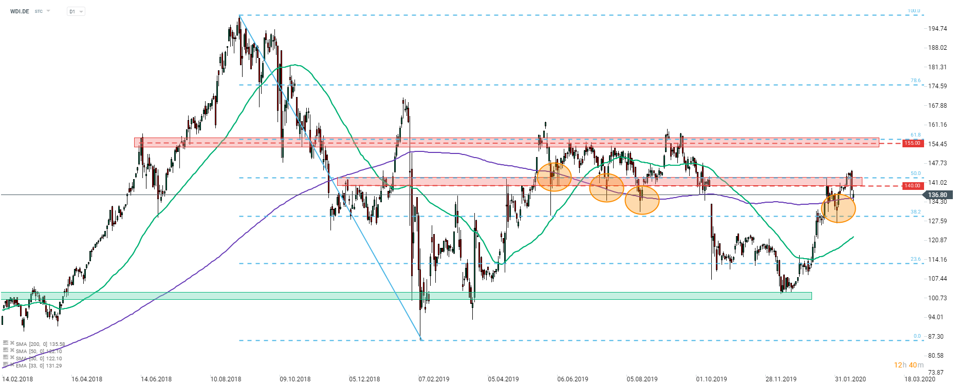 A Wirecard (WDI.DE) múlt héten visszahúzódott az 50%-os Fibo-szintről, ma pedig megint egy esést produkált, miután újabb hírek jelentek a társaság megkérdőjelezhető üzleti gyakorlatáról. Az esést ugyanakkor megállította a 200 napos mozgóátlag (lila vonal). Érdemes megjegyezni, hogy a mozgóátlag korábbi támadásait gyakran egy-egy gyors felpattanás követte (narancssárga körök). Forrás: xStation5