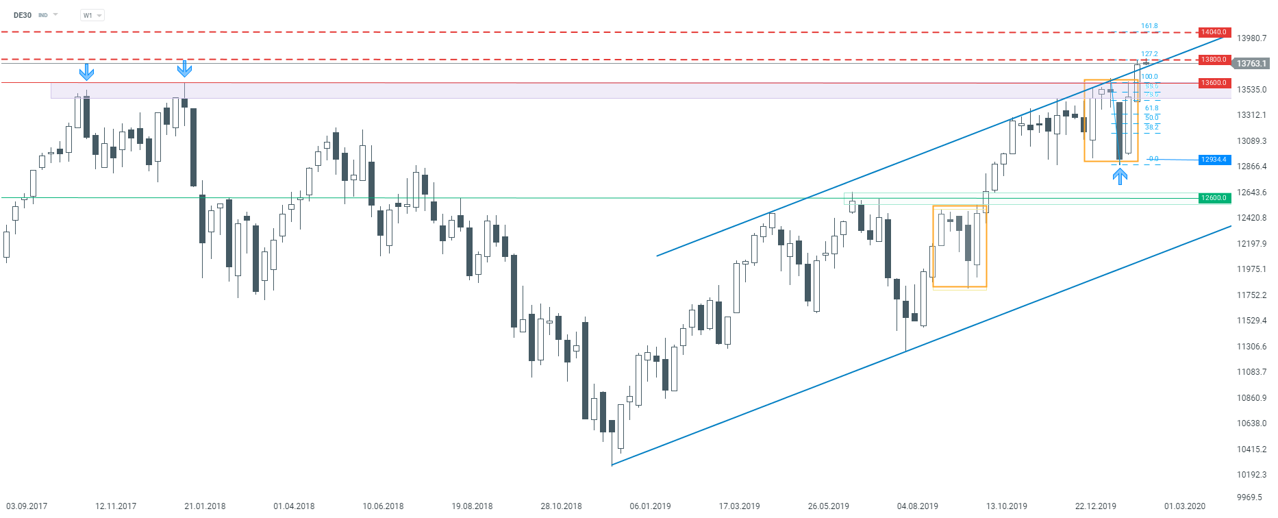 A német DAX ma újabb történelmi csúcsot állított be, 13.796 pontig jutott az index. Nyitás után azonban lefelé tartó mozgás indult, amihez a heti grafikonon látható folyamatok adhatnak magyarázatot. A DAX 2018 vége óta egy emelkedő trendcsatornában mozog és múlt héten elérte ennek a csatornának a tetejét. A 13.800 pontnál lévő zóna ráadásul a 2020 januárjában lezajlott korrekcióból számított külső 127,2%-os Fibo-szinttel is egybeesik. Ha az index mégis magasabbra törne és eltávolodna az emelkedő csatornától, a bikák figyelme a legközelebbi ellenállásra koncentrálódhat, ami a 161,8%-os külső Fibo-szintnél, 14.040 pontnál található.