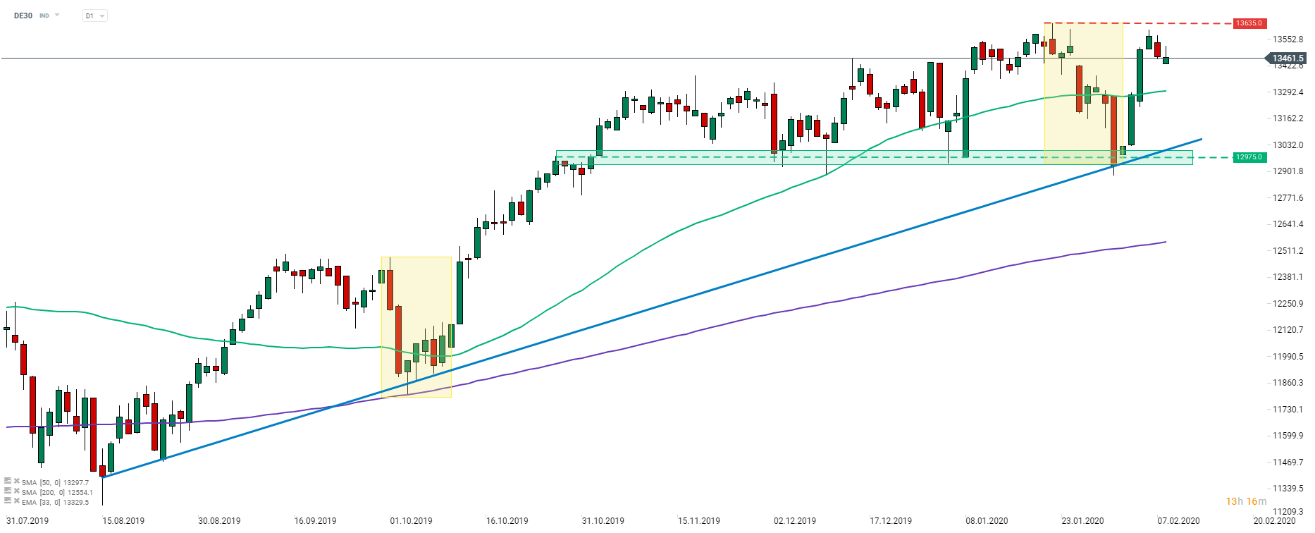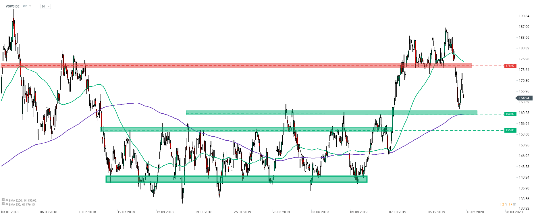 A Volkswagen (VOW3.DE) a 185 eurós szintről kezdett esni januárban, a lefelé tartó mozgást a 160 eurós zóna állította meg, de nem tudott visszatérni a 175 eurós szint fölé az esést követő pozitív korrekció során és újra lefelé vette az irányt. Rövidtávon a korábban említett, 160 eurónál található támaszt érdemes figyelni, amit a 200 napos mozgóátlag is erősít (lila vonal). Forrás: xStation5
