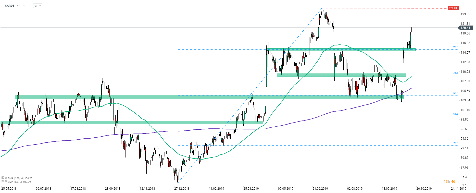 A júliusi csúcs után (12645 pont) a német DE30 (DAX határidős termék) folytatta a felfelé irányuló mozgást. Az index tegnap erőteljesen vadászta le a magas értékeket, viszont a mai szeánsz elején lecsillapodott. Az első ellenállás szintet a 2018. augusztusi csúcs jelzi (12825 pont). Ha az Egyesült Királyság parlamentje egy Brexit-megállapodás mellett szavaz, arra számíthatunk, hogy az európai indexek szabad utat kapnak. Ha a felfelé irányuló mozgást egy szilárd lendület kíséri, akkor a következő ellenállás 13160-nál lesz. Csütörtök valószínűleg nagy nap lesz a német index számára, mivel az októberre vonatkozó előzetes PMI-adatokat közzéteszik. Egy újabb katasztrofális erdemény negatívan hathat az indexre. Egy másik csütörtökön megfigyelhető esemény az EKB ülése. Várható azonban, hogy a Bank tartózkodik attól, hogy Draghi záró ülésén jelentős politikai módosításokat végezzen.