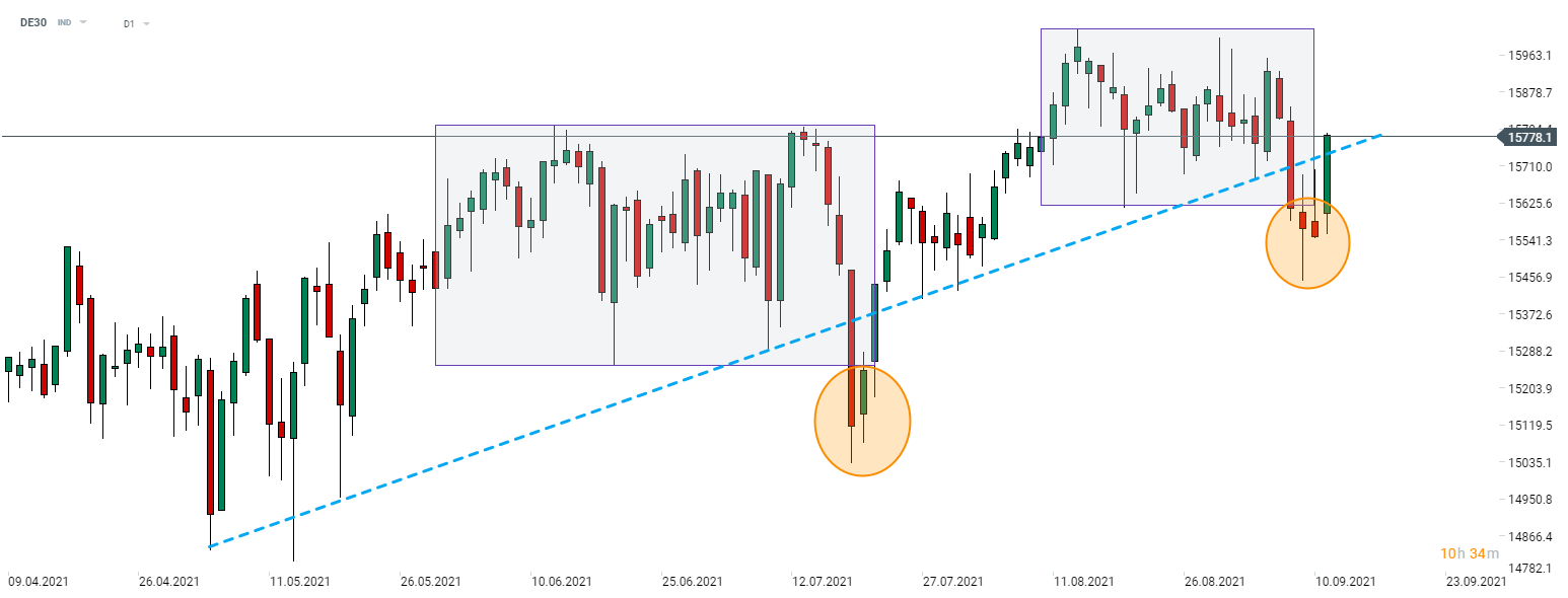 DE30, as well as other European indices, enjoy big price gains at the start of a new week. Asian and European sessions have been rather quiet in terms of data and it looks like the move may have a technical background. Taking a look at the DE30 chart we can see that the index is recovering following another false, downside breakout (orange circles). Index plunged below the lower limit of its recent trading range last week but bears failed to sustain the move. Spinning top candlestick was painted on the daily chart on Thursday and DE30 started to regain ground. Index is trading a touch below 15,800 pts at press time. A point to note is that the previous false breakout was followed by a move towards fresh all-time highs.