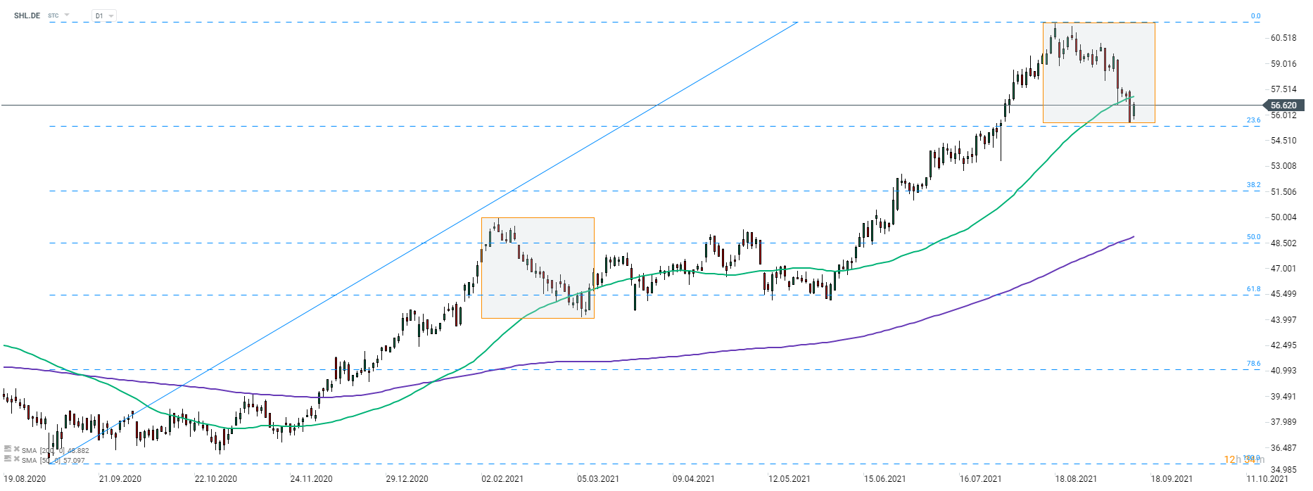 Siemens Healthineers (SHL.DE) trades higher today after the CEO hinted that new medium-term targets will be higher than current targets. Stock is also supported by the price target boost it received at Berenberg. A look at the chart shows that share price launched recovery following a test of the lower limit of the market geometry near 23.6% retracement of an upward impulse launched a year ago. Source: xStation5