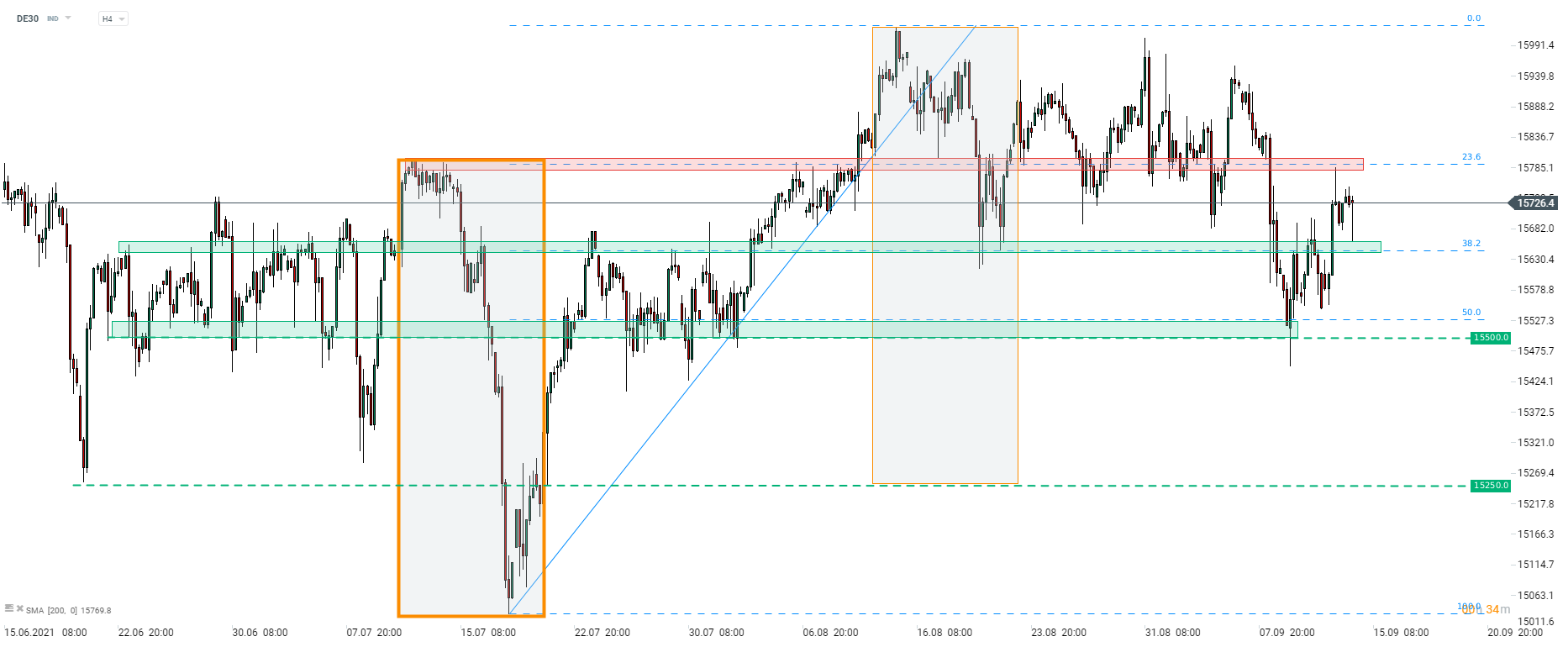 DE30 keeps recovering from last week's drop. The index climbed above the price zone marked with 38.2% retracement of the upward impulse launched in mid-July and tested resistance at 23.6% retracement (15,800 pts area). Index pulled back overnight and tested the aforementioned 38.2% retracement once again this morning - this time as a support. A point to note is that the recovery move launched on Thursday last week is exhibiting a clear uptrend structure with higher highs and higher lows. Having said that, the base case scenario looks to be for the upward move to continue.