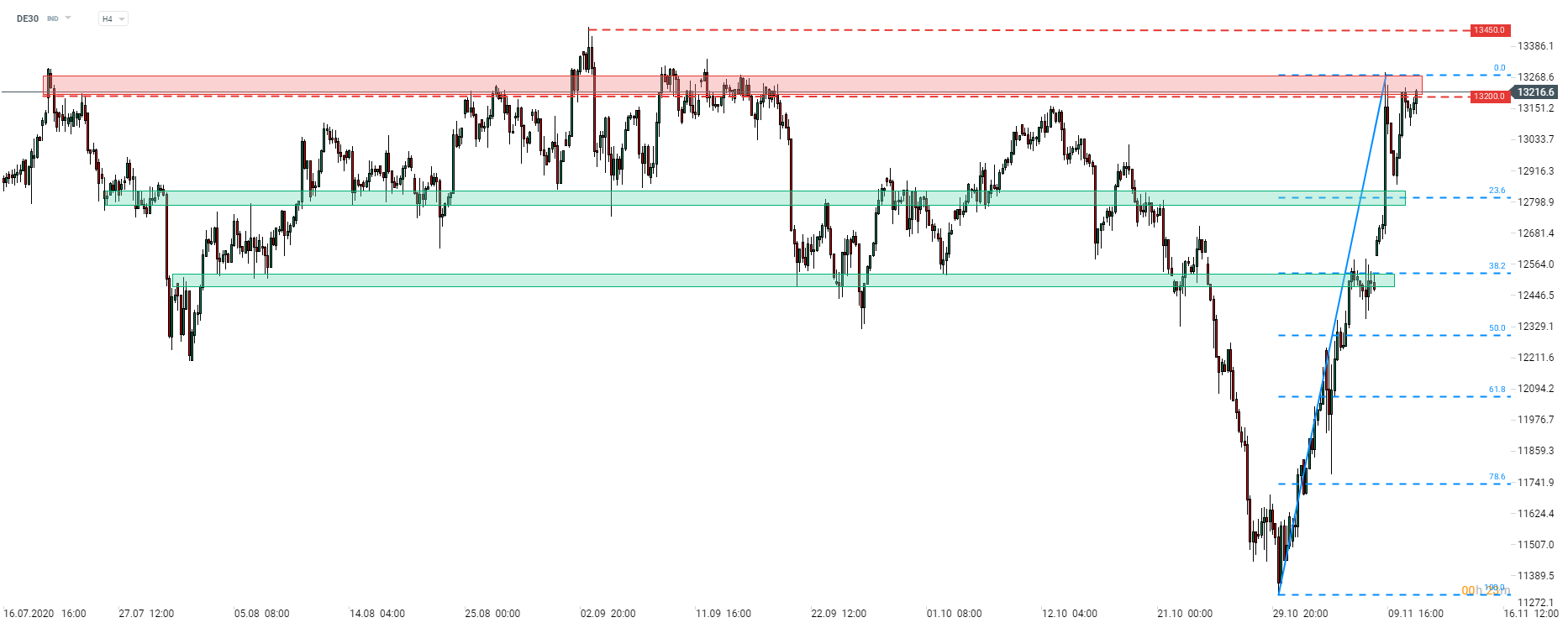 Value stocks have a bigger share in the German index than in the US indices and therefore DE30 continues to outperform US peers amid tech to value rotation. DE30 has approached an important resistance zone ranging above 13,200 pts today. Note that the index has already failed to break above it twice this week. In theory, the chance of breaking higher increases with each subsequent test. Should we see a break, bulls' attention will shift to post-pandemic high in the 13,450 pts area. Source: xStation5