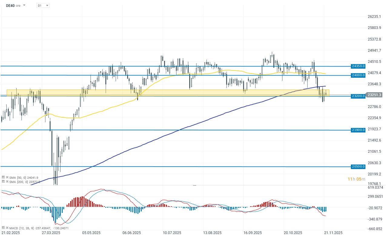 A német index jelenleg teszteli az április vége óta fennálló konszolidációs csatorna alsó határát. Ez a leghosszabb időszak, amelyet eddig a 23 200 pontos zónában töltött. Ha a bullok nem tudják megtartani ezt a támaszt, akkor technikai szempontból a kiárusítás gyorsan mélyülhet.