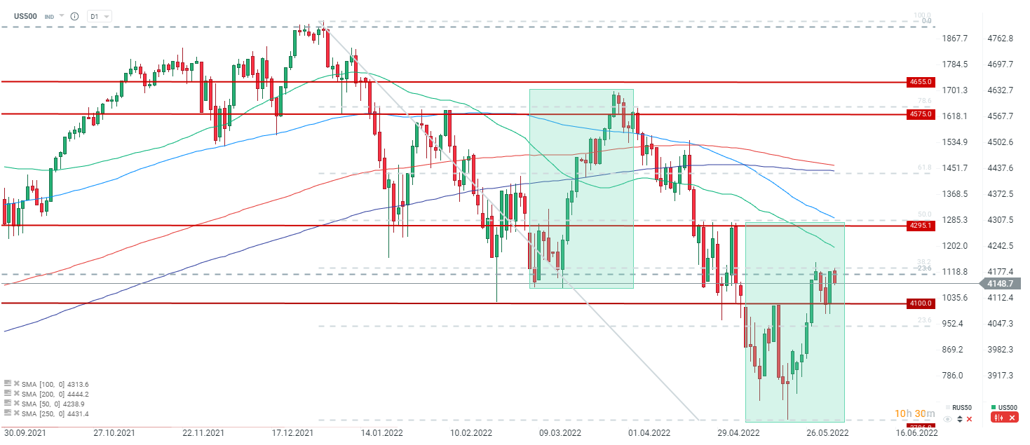 EURUSD returned towards recent local highs, what may be related to weaker data readings, especially ADP reading yesterday. However, it will be wage growth that is most important for index or USD traders. If wage growth had peaked by now, it would be a bullish sign for equities. US500 continues to struggle with breaking above a 4,200 pts resistance zone.