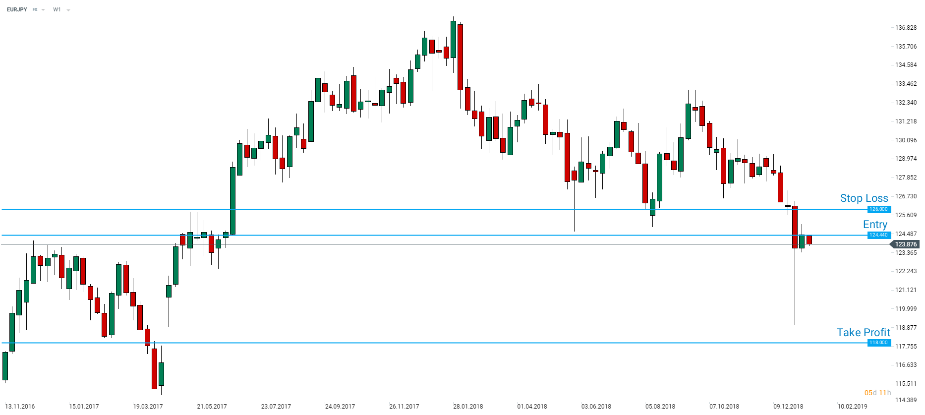 Bank of America Merrill Lynch short pozíció felvételét javasolja az EURJPY devizapáron, 126.00 célárral és 118.00 stop szinttel. Forrás: xStation5