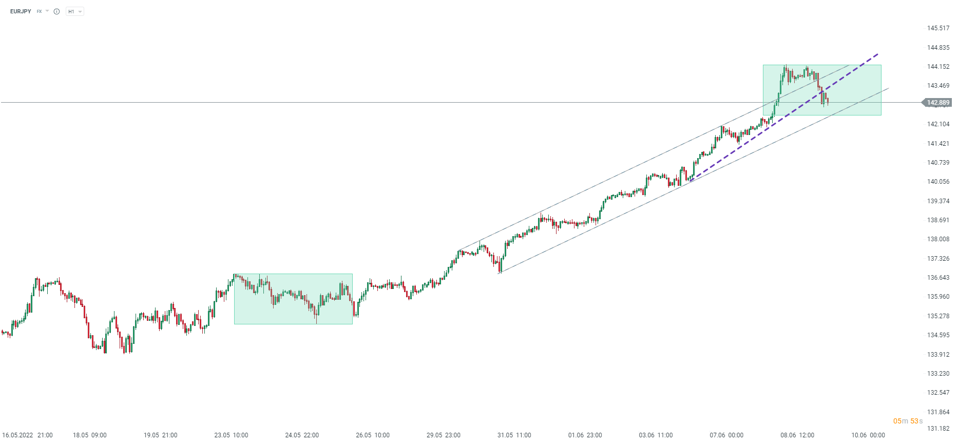The yen gains not only against the dollar, but also against the euro. The target of the current decline may be the area of 142.5, where the lower limit of the upward trend channel is located. Source: xStation5