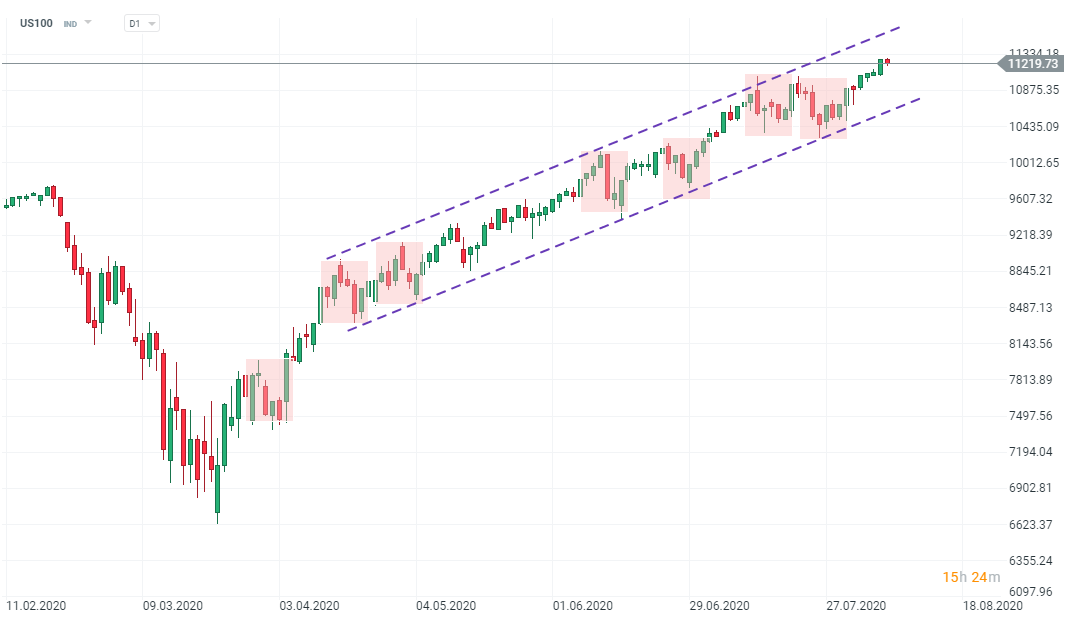 Az US100 magasabbra emelkedett a minden idők legmagasabb pontjai felé. Látható, hogy továbbra is meglehetősen szabályos felfelé irányuló csatornában marad, és a korrekciók eddig mérsékeltek és szabályosak voltak. A csatorna felső határa 11650 pont körül van. Forrás: xStation5