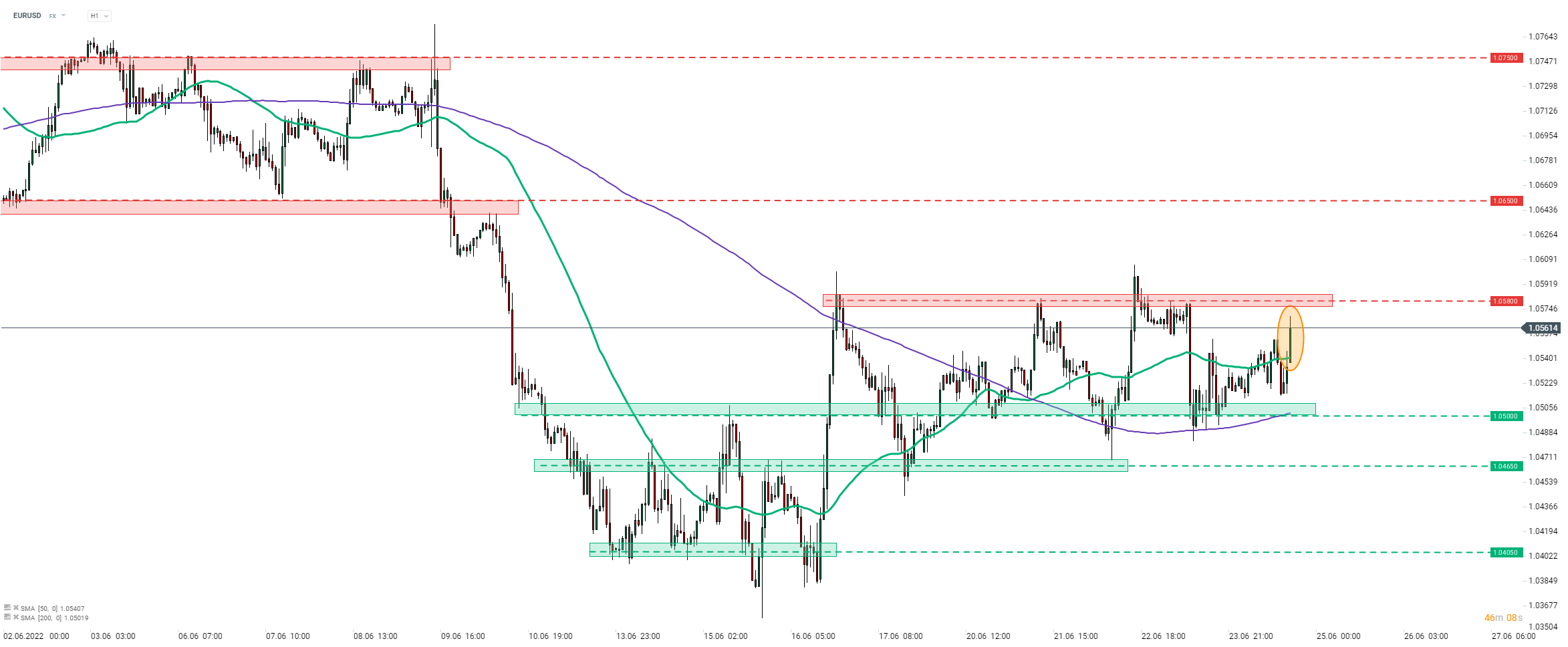 EURUSD caught a bid as US dollar pulled back in response to Michigan data revision (orange circle). Main currency pair is approaching the 1.0590 resistance zone. Source: xStation5