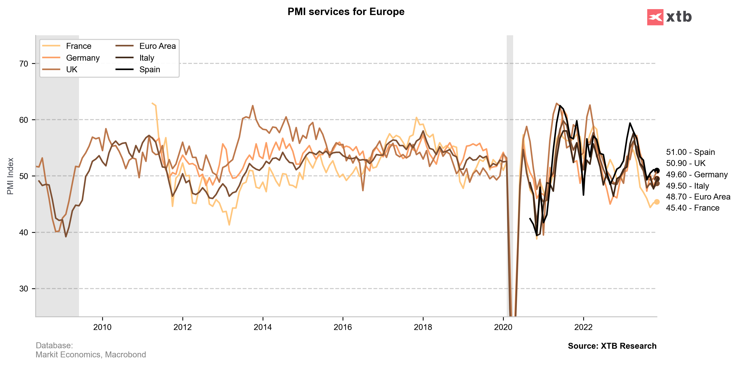 Services PMI data for the world's major economies fared mostly better than estimates indicated. Although the situation in European countries is still tense, economic momentum according to survey data is improving. Among the published data, the only surprise on the downside was from Spain. Source: XTB Research