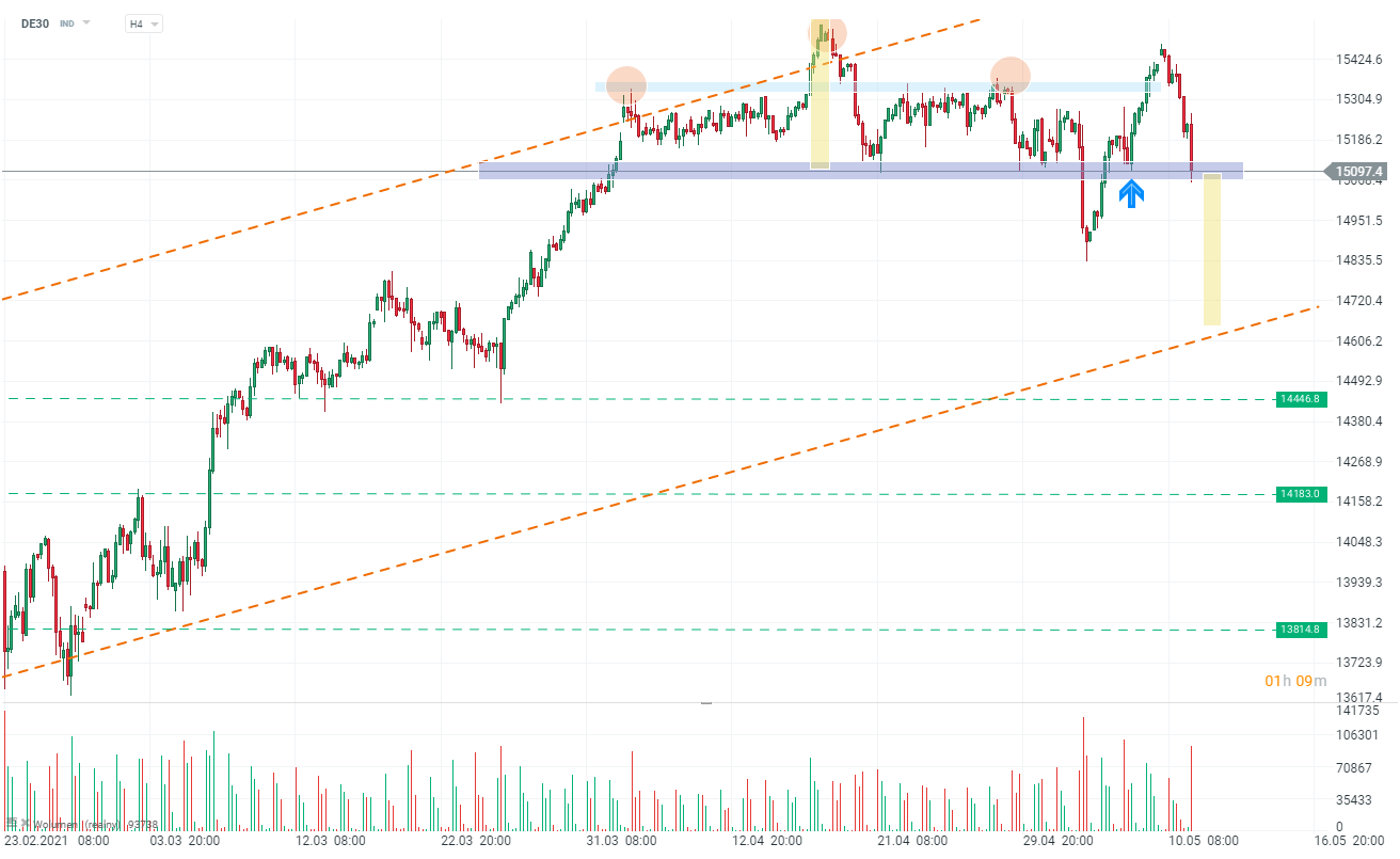 A piacok a hetet derűs hangulattal kezdték, miután a Fed múlt pénteken nyíltan éljenezte a gyengébb NFP-jelentést. A bullish lendület azóta elhalványult, mivel a befektetők nem biztosak abban, hogy az emelkedő infláció milyen módon bonyolíthatja a gazdaságot. Míg a kulcsfontosságú adatok holnap jelennek meg (amerikai CPI, 14:30), a DE30 máris teszteli a kulcsfontosságú 15100-as szintet – egy sikertelen fej-váll alakzat nyakvonalát. Az index a múlt héten átrobbant ezen a támaszon, csak azért, hogy kétszer is hamis jelzést adjon – egyszer lefelé, egyszer pedig felfelé. Vajon ezúttal is megfékezi majd ez a szint? Egy alacsonyabbra törés a felfelé irányuló csatorna alsó határához vezethet.
