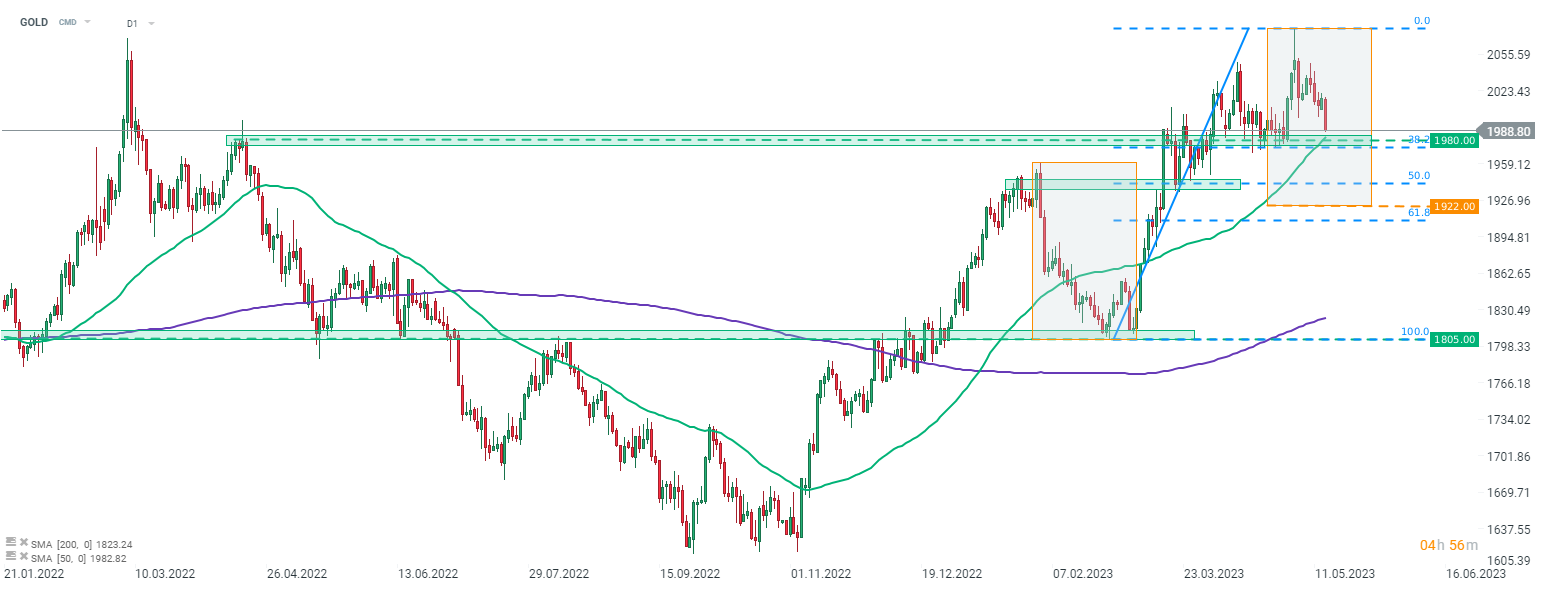 Taking a look at GOLD at D1 interval, we can see that the price of this precious metal is dropping more than 1% today and has broken below the psychological $2,000 per ounce mark. A near-term support zone to watch can be found in the $1,980 area, where the 50-session moving average (green line) and 38.2% retracement of the upward move launched at the turn of February and March 2023 can be found. A break below this hurdle would pave the way for a test of the 50% retracement in the $1,940 area. However, a key support zone to watch can be found around 1% lower in the $1,922 area, where the lower limit of the Overbalance structure can be found.