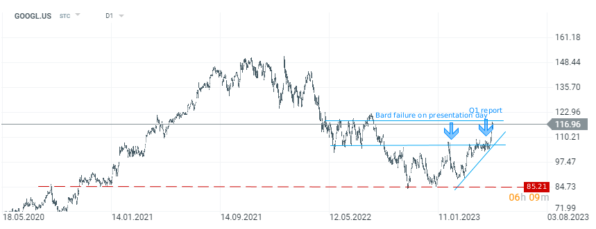 Alphabet stocks (GOOGL.US) have resumed an upward trend following several positive announcements, including the recent Bard update and strong Q1 earnings. In February, there was a period of panic selling by investors when Google initially presented its generative AI model, Bard, at a conference. The event was perceived as a failure as the AI didn't perform as expected and provided incorrect answers. However, with a significant update since then, the sentiment towards the company is now shifting back to positive.