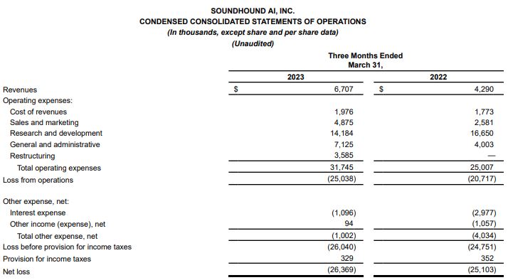 Above, we see that despite SoundHound's revenue growing ($6.7 million vs. $4.29 million: +56.34%) also it's losses are increasing. Even if we consider your restructuring expenses as a one-off, non-recurring item, the fact remains that there is immaterial costs increase that is diluting the positive margin.