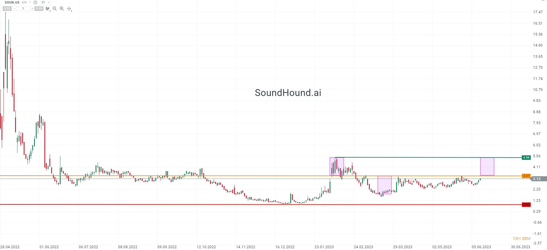 SoundHound Inc. (SOUN.US) is another of the companies with potential in artificial intelligence (AI) developments. This in particular is a leading artificial intelligence company based in Santa Clara, California. Its main focus is the development of AI-based music and voice recognition technologies. The company is notable for its flagship product, the app of the same name SoundHound, which allows users to identify songs simply by humming or singing a part of the lyrics. Unlike other apps like Shazam, which needs to recognize the exact song in order to give a positive response, with SoundHound it won't be necessary.