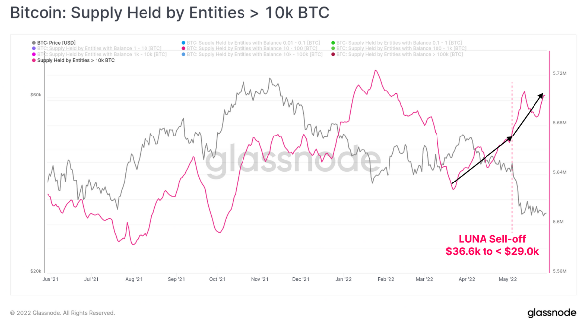 The number of entities holding more than 10,000 BTC has steadily increased. The trend also seemed immune to the fall of Terra (Luna). The project held the place of one of the leaders in the crypto industry. Source: Glassonde