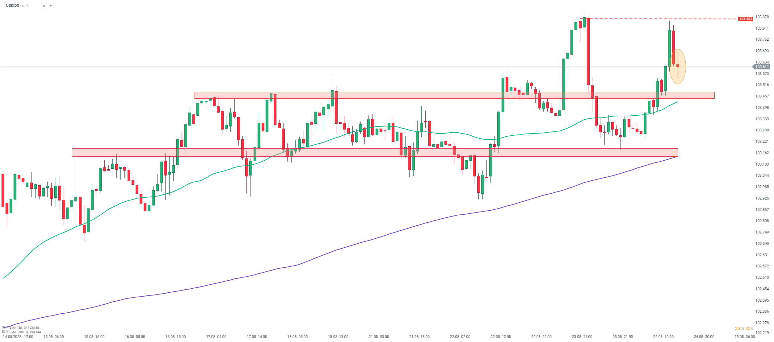 Az amerikai dollárindex (USDIDX) enyhén csökkent a Fed Harker dovish megjegyzéseit követően. Forrás: xStation5