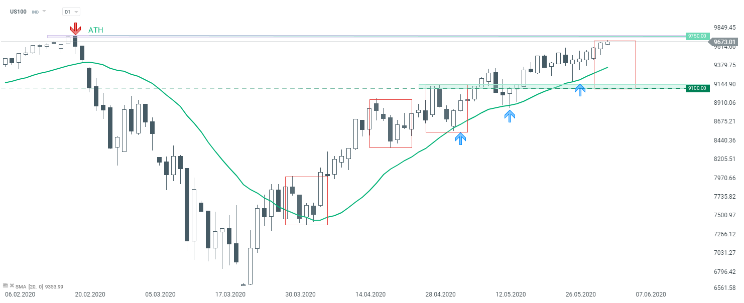 Végül, de nem utolsósorban nézzük meg az amerikai technológiai vállalatok indexét, ahol az emelkedő trend folytatódását figyelhetjük meg. Az US100 a történelmi csúcsa közelében mozog, ami azt jelenti, hogy szinte teljesen ledolgozta a február-márciusi pánikszerű esést. A trend továbbra is felfelé tart és a grafikonon semmilyen medvepiaci jelzés nem látszik jelenleg. A legközelebbi ellenállás a 9750 pontos terület, ennek áttörése viszont nagyobb felfelé ugrást válthat ki. A stop loss megbízások valószínűleg e szint felett aktiválódnak, ami felerősítheti a felfelé tartó mozgást. A másik oldalról viszont egy tökéletes helyet jelent egy lefelé tartó korrekció megindulásához. Mindenesetre amíg az árfolyam 9100 pont felett áll, addig marad a felfelé tartó trend. A 20 napos mozgóátlag letörése lehetne a gyengeség első jele.
