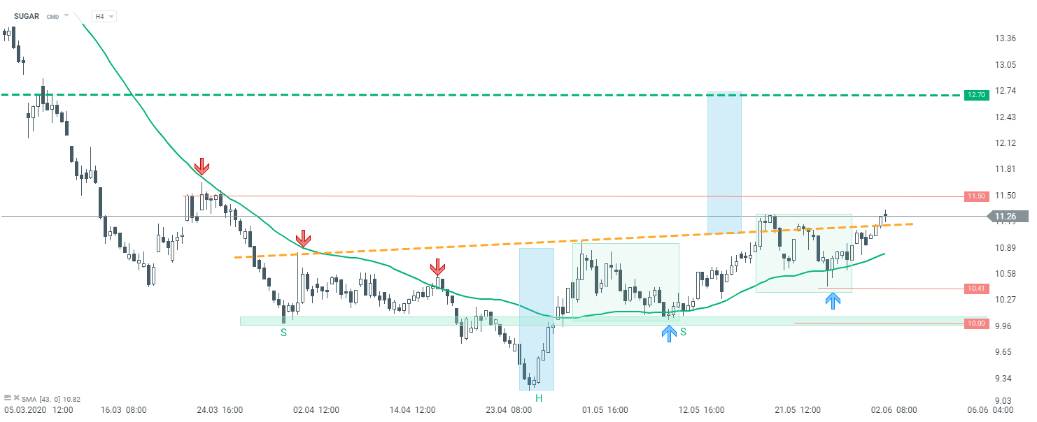 A cukor árfolyama próbál felépülni a legutóbbi esésekből. A napi grafikont nézve úgy tűnik, van rá esély, hogy egy nagyobb korrekció induljon meg felfelé. A 4 órás intervallumon látható, hogy az ár áttörte a fordított fej-váll alakzat nyakvonalát, és közeledhet a trendforduló. Az első próbálkozás májusban még sikertelen volt, de miután az árfolyam támaszra talált a lokális piaci geometria alsó határán, újra erősödésnek indult. Ráadásul az árfolyam a 43 napos mozgóátlag felett tudott maradni, ami korábban ellenállásként és támaszként is szolgált már. A legközelebbi ellenállási szint 11.50, ahol a márciusi csúcsok is voltak.
